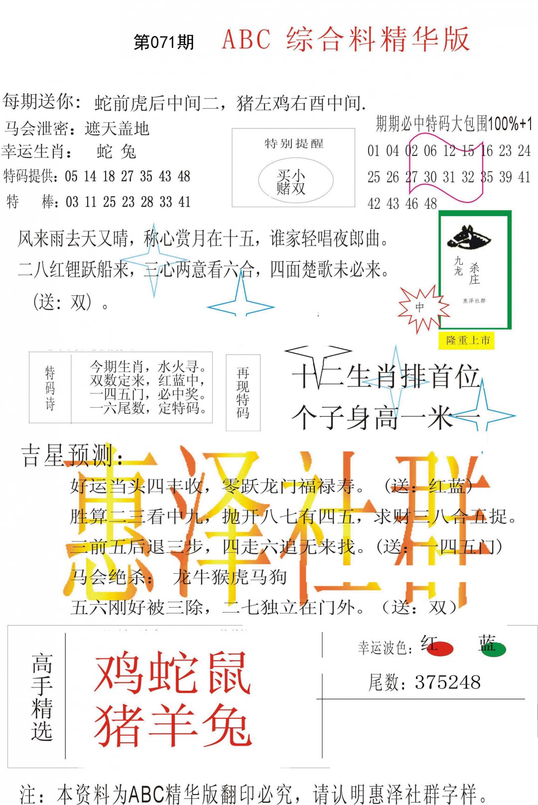 071期必中①肖: 马 |